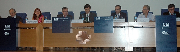 Los representantes de las sociedades científicas implicadas junto a Javier Maldonado y José Soto, gerente del Hospital Clínico.