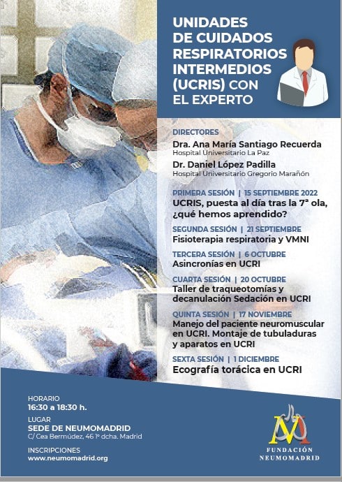 Desde el grupo de Sueño y VMNI de NEUMOMADRID, hemos organizado un curso consistente en 6 tardes con el experto, para ampliar los conomimientos en ventilación mecánica no invasiva y en manejo del paciente en las unidades de cuidados respiratorios intemedios.Siendo este el año de las UCRIS, hemos querido ampliar los conocimientos en este campo.El curso se desarrollará en seis sesiones durante los meses del último cuatrimestre del año. Cada sesión tendrá una duración de dos horas. El curso es online y presencial hasta completar el aforo.